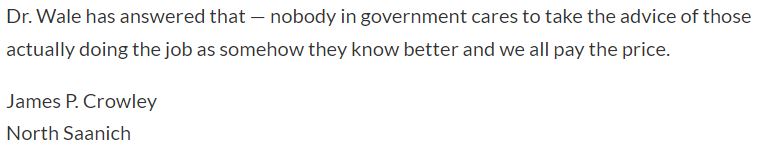 I am a solution-focussed Doctor and again, will not spend any more time saying that “I told them so” and they did not listen. What I have learned over the years is that the planning and implementing of health and care in B.C. is political and not scientifically driven. 😦