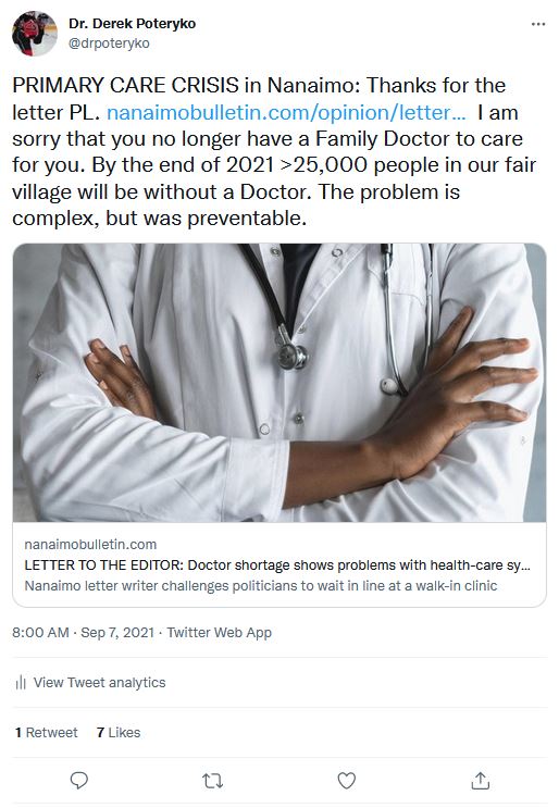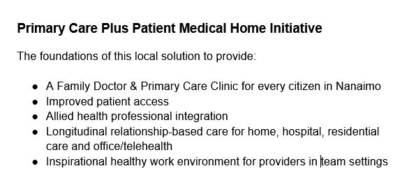 As a Nanaimo Family Doctor who has had the honour and privilege of taking care of my practice of patients since 1993, I have witnessed and have felt helpless (sometimes hopeless) watching this most unfortunate and preventable event from happening. I have written and spoken out many times over the years warning that this was the future of community health and care in Nanaimo if we did not change course.