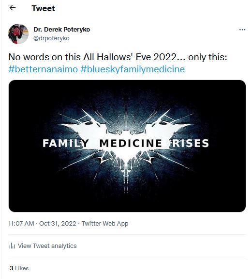 With Health Care in crisis, there are over 36,000 Nanaimo-ites without a Family Doctor (or primary care provider)… with the increased demands (I am asked daily about taking on new patients who have no care – sorry we are so full), limited resources and the associated moral injury… this has caused more healthcare workers than ever to report some form of burnout or fatigue these days. 😦