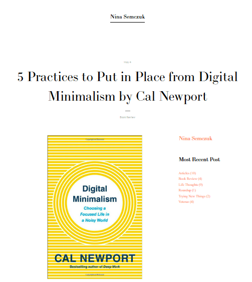I found this book review by Nina Semczuk on Cal Newport’s book Digital Minimalism very helpful with establishing healthier and more fuctional e-boundaries: