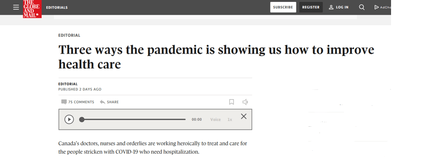 This recent editorial in the Globe and Mail speaks volumes on what has been missing in our pre-COVID primary care healthcare system in Nanaimo, B.C. and Canada.