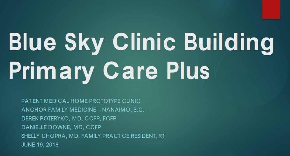 With that, since 2016, we have been evolving and improving the concepts of Blue Sky Family Medicine in Nanaimo and presented our research findings to the province in 2018.